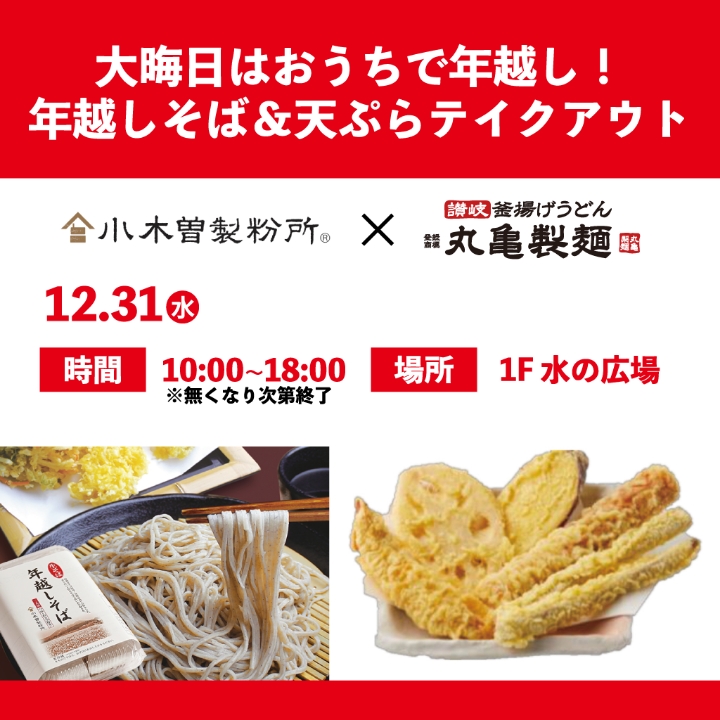 年越しそばと天ぷらのテイクアウト集合催事となります。小木曽製粉所の自社で製粉した二八そばと丸亀製麺の出来立て天ぷらを、ご自宅でお楽しみください。